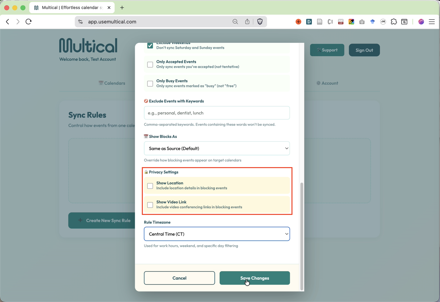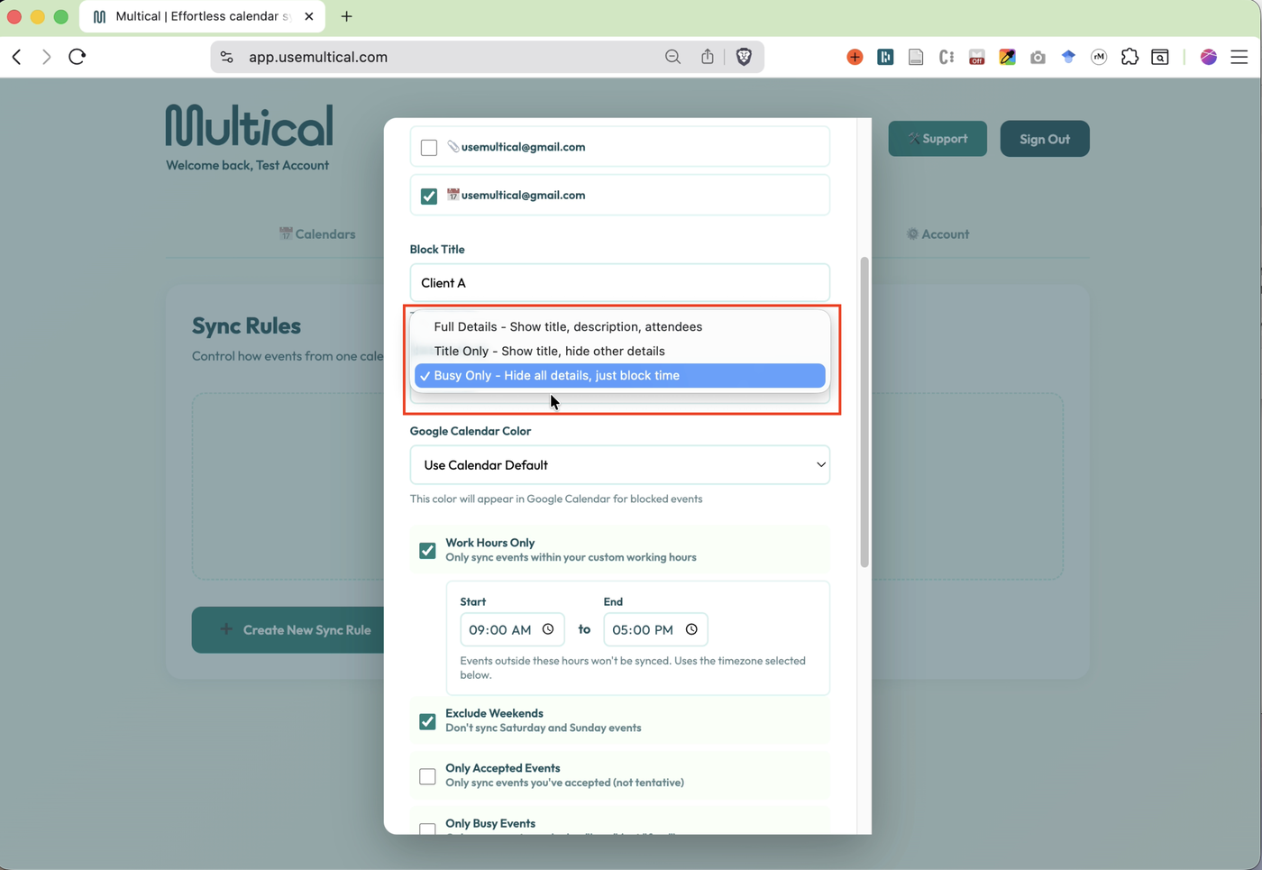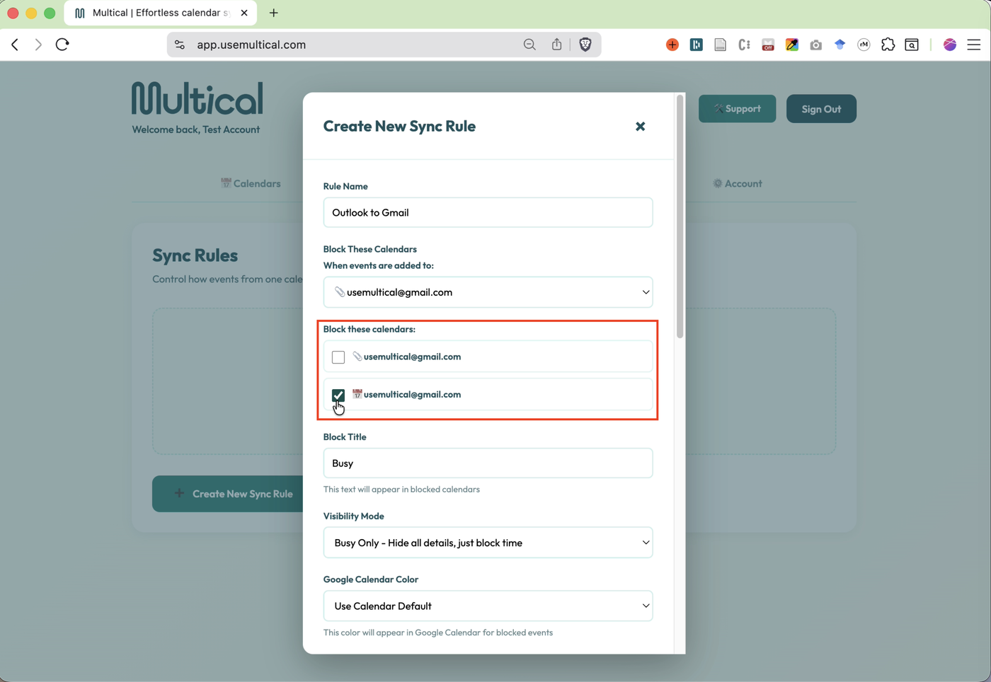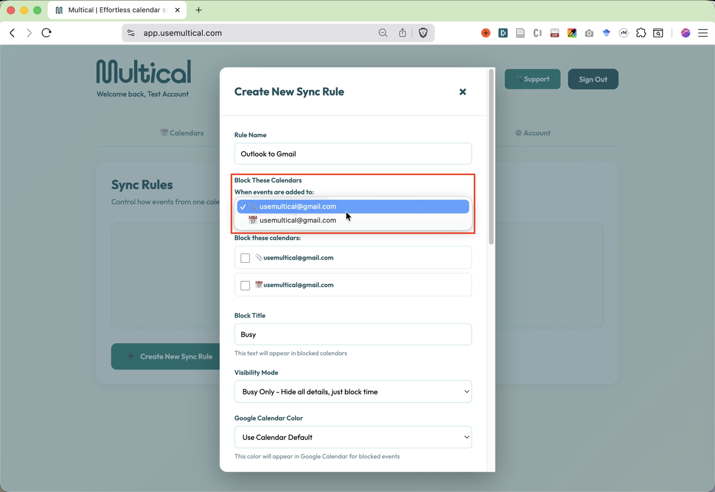 Select your target calendar, the calendar to which events will be synced.