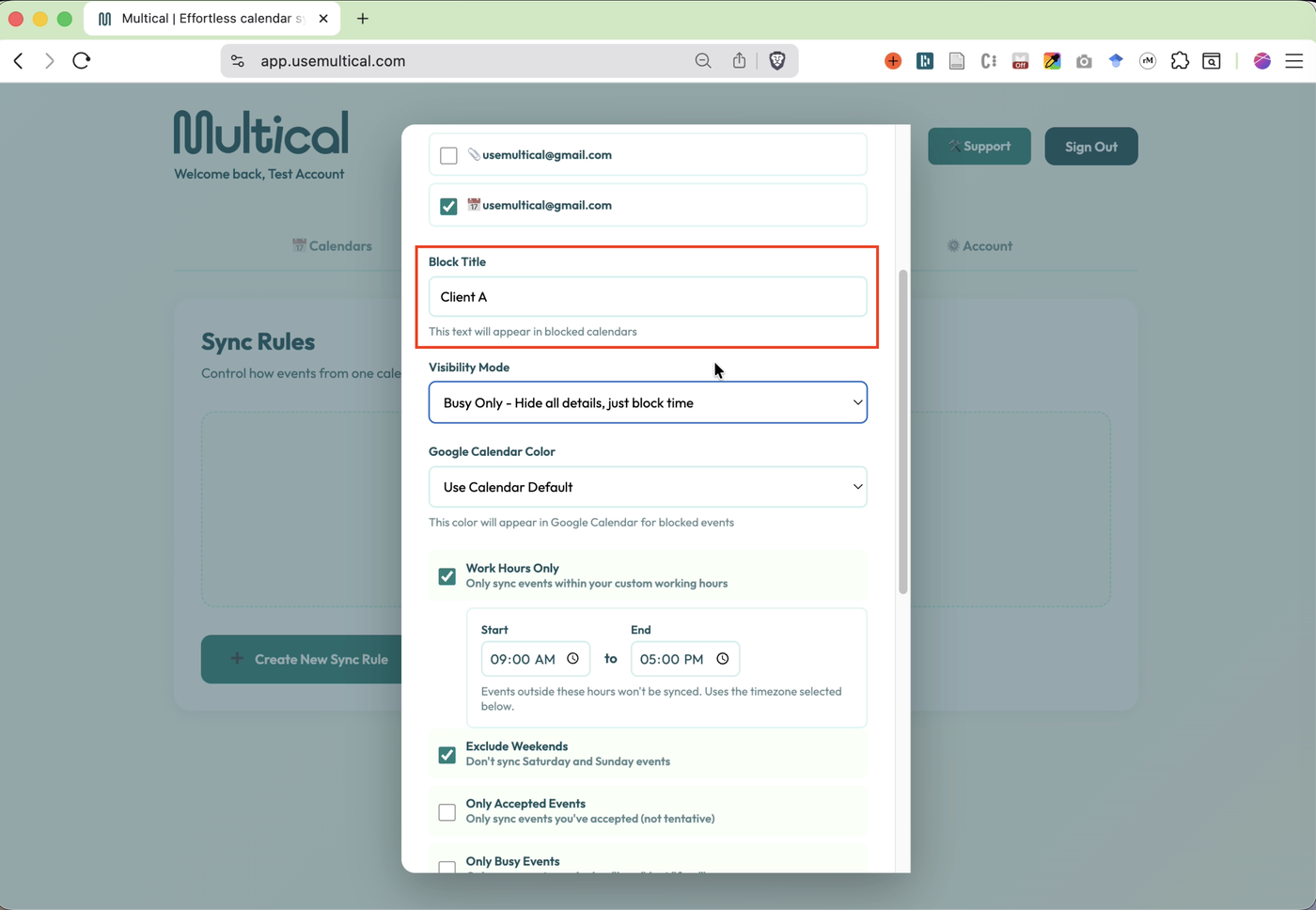 Note: Sometimes calendars from different provides may share the same email. In those cases, use the emojis to distinguish. Multical uses 📆 for Google calendars, 📎 for Microsoft calendars, and 🍎 for Apple calendars.