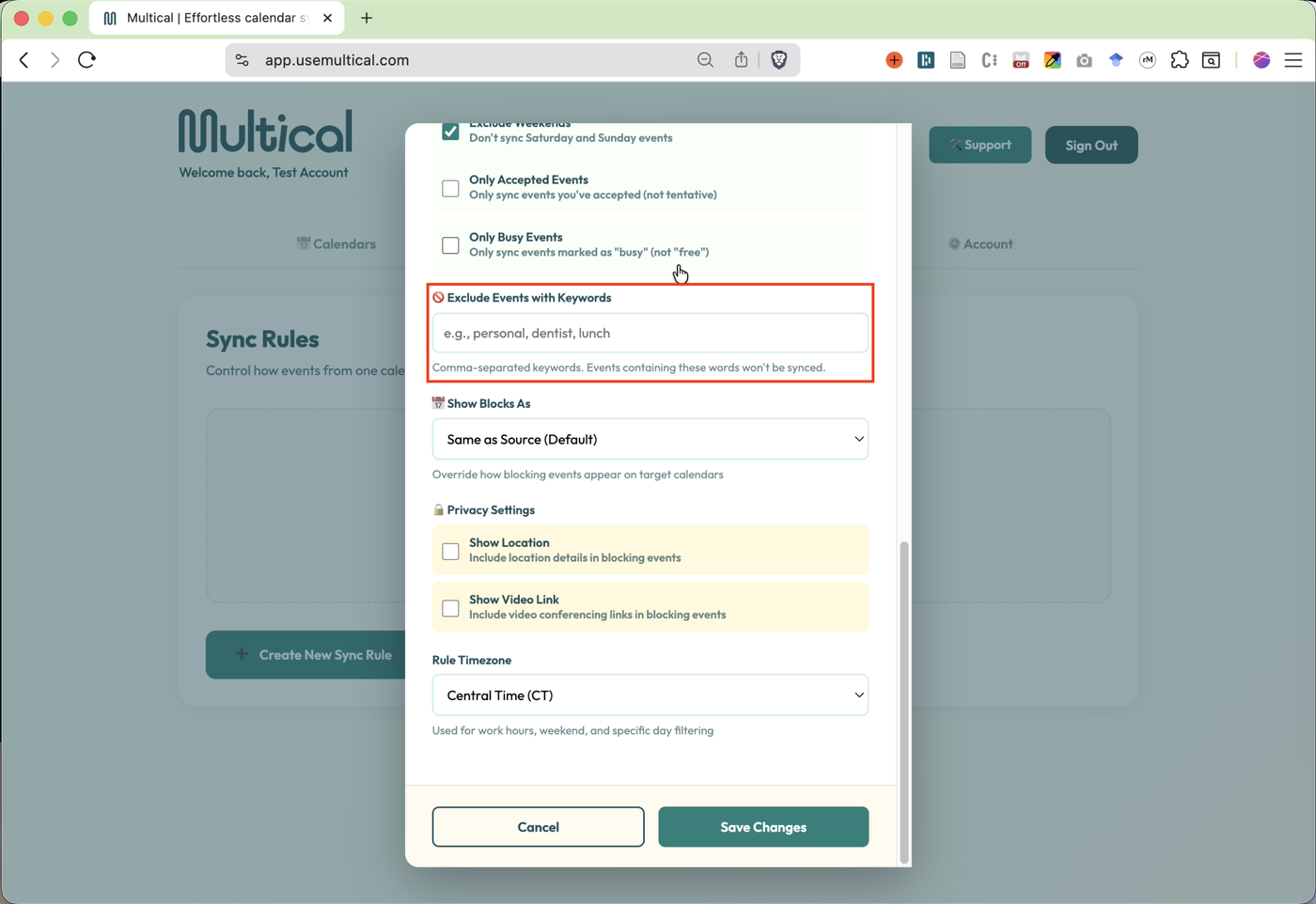 Define any keywords that you would like to use as a signal to skip syncing an event from the source calendar.