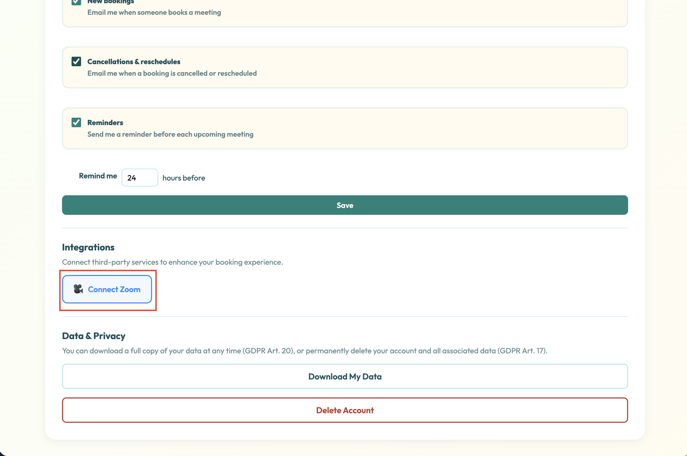 Navigate to the Account tabClick the connect Zoom button Sign into your Zoom accountYour Zoom account is now connected!