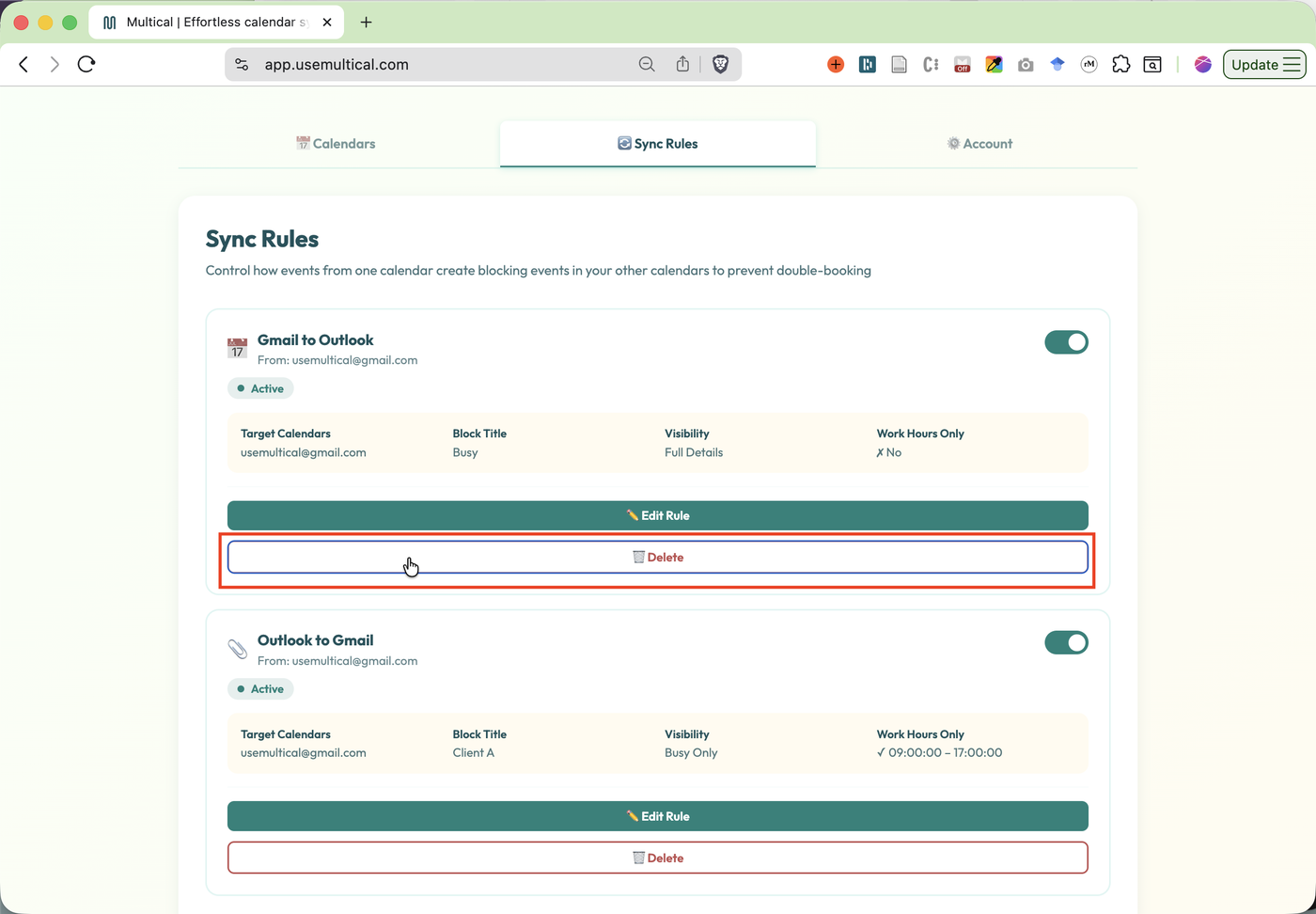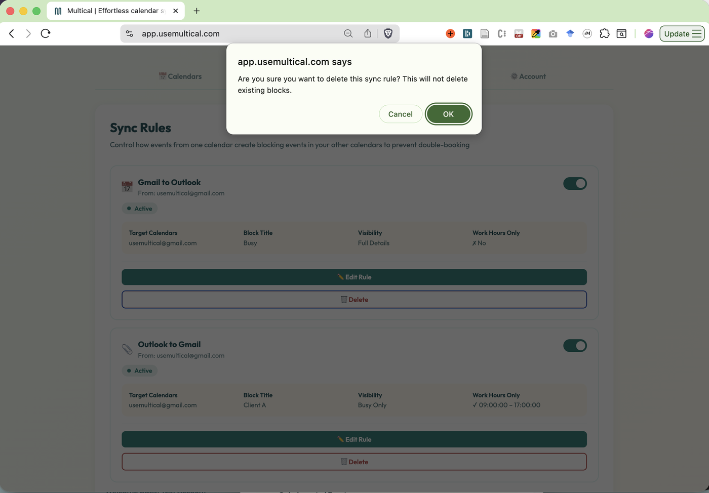 Note: If you would like to delete the events created by Multical, you must disconnect your calendar.