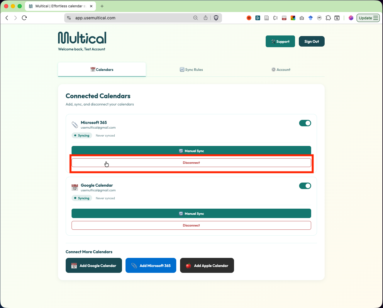 You can disconnect a calendar by clicking the Disconnect button on the Calendars tab.