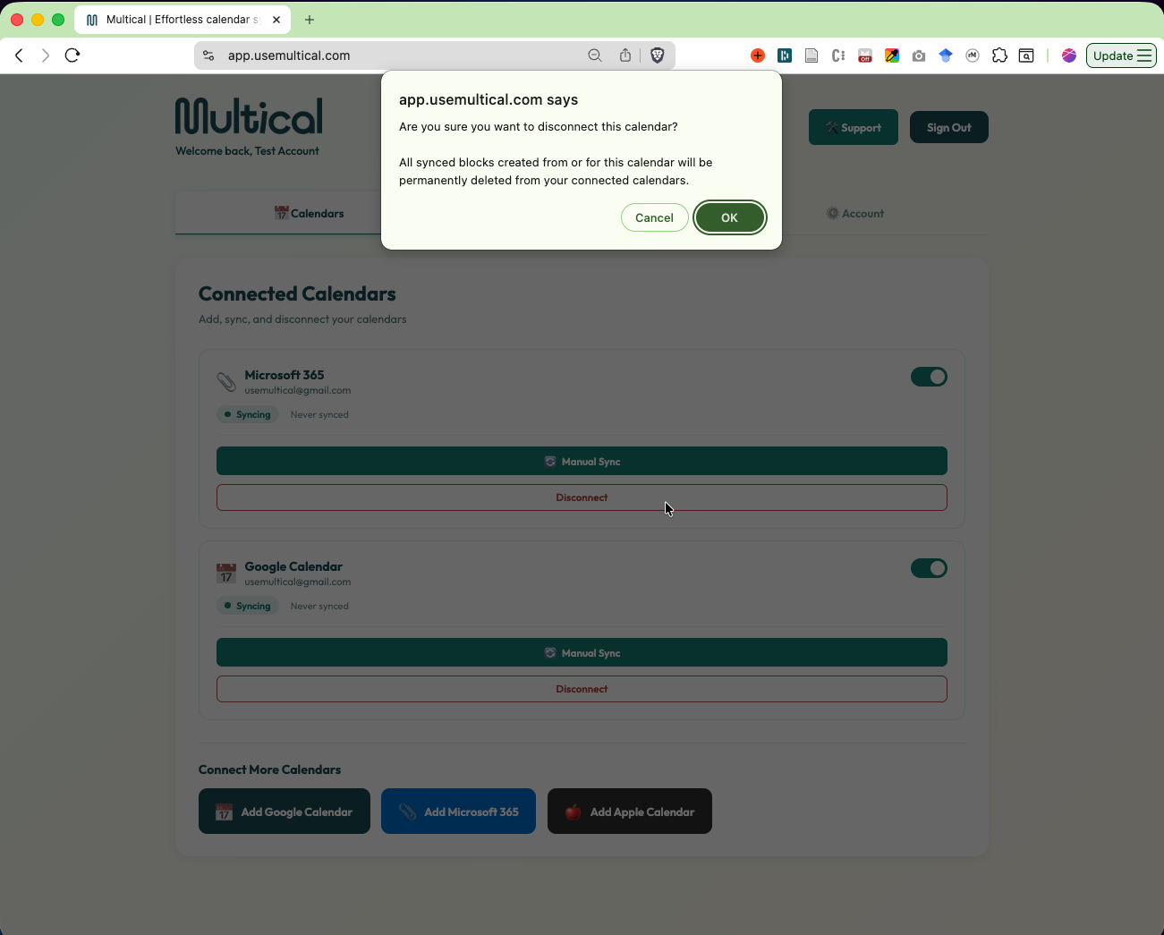 As the popup shows, disconnecting Multical will remove any blocks where this calendar is the source or the target calendar. It will not remove any events you have created outside of Multical.