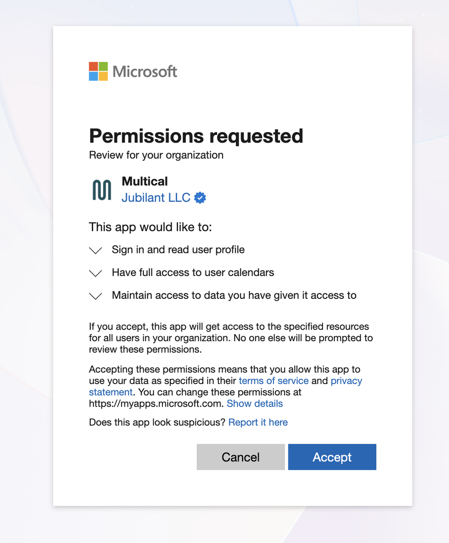 If you manage Microsoft 365 for your organization, you may need to approve Multical before your team members can connect their Microsoft calendars.