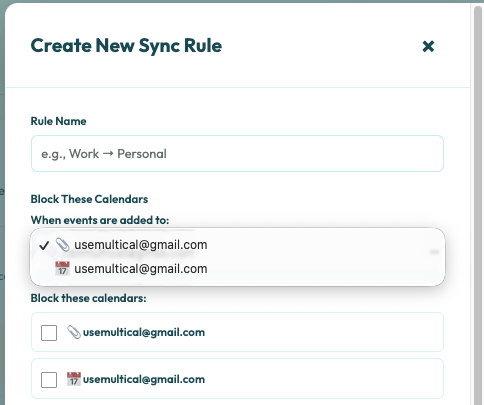 In some instances, an Outlook, Google, and/or Apple calendar may appear to have the same email address. This can be confusing when you’re creating Sync Rules.